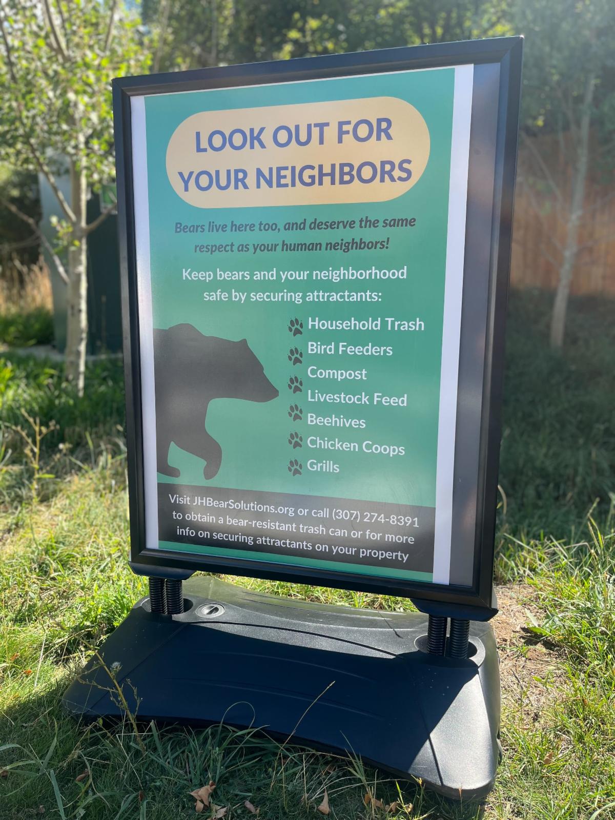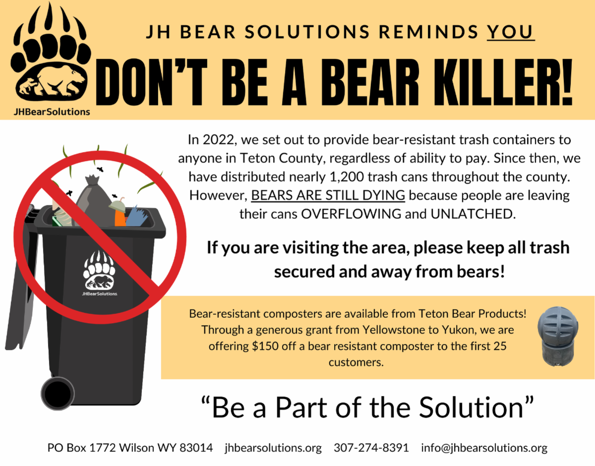 We are continuously getting messaging out about making Teton County a bear safe community through radio announcements, signs around neighborhoods, trash can distribution, banners around town, and stickers on cans telling people not to overfill their cans. Both black bears and grizzly bears continue to be involved in conflicts throughout the County. We can and must do better and we will continue these efforts until we get to zero human/bear conflicts!