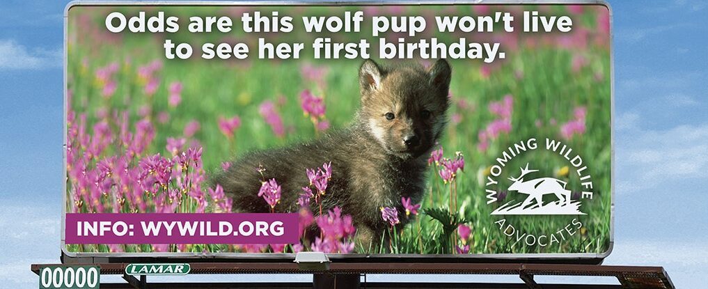 CODY, Wyoming, (June 18, 2019)—Funded by Wyoming Wildlife Advocates’ supporters, a new billboard in Cody, Wyoming, aims to educate the public about Wyoming’s outdated and anachronistic wolf management policies. The billboard features a wolf pup with the tagline, “Odds are this wolf pup won’t live to see her first birthday.”
